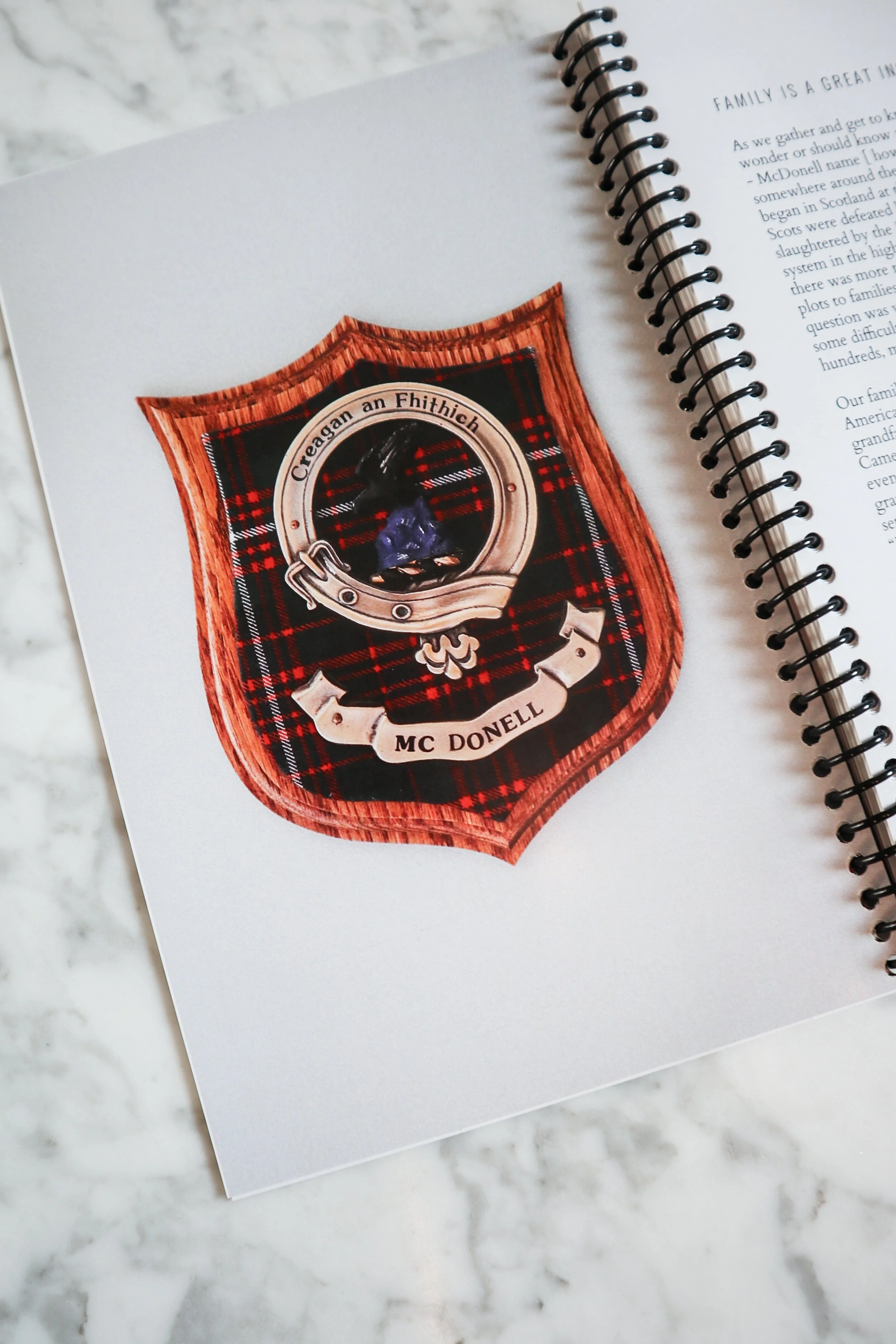 The end papers showcase the McDonell tartan.